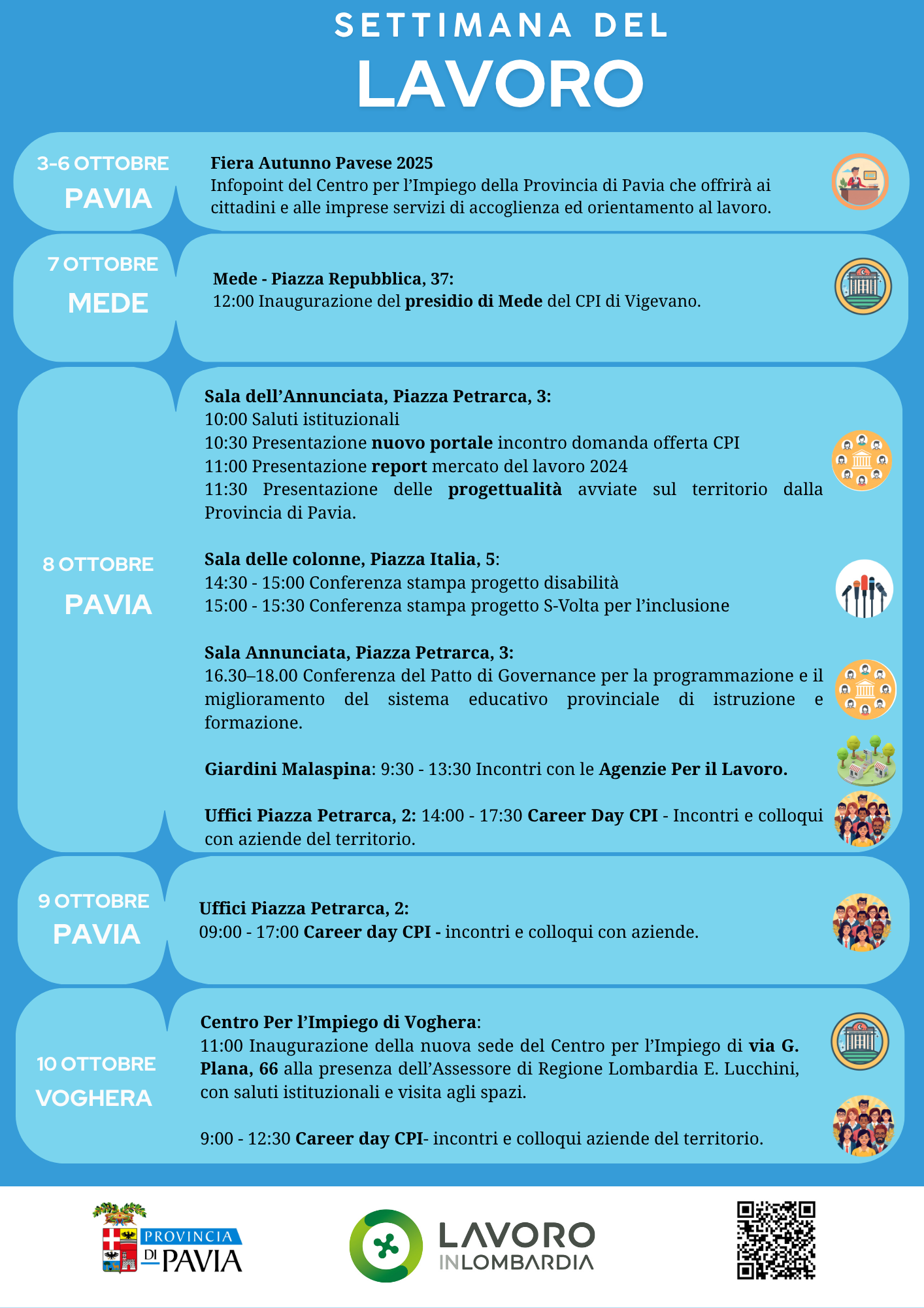 La Settimana del Lavoro rappresenta inoltre un’occasione per fare il punto sulle politiche attive avviate dalla Provincia di Pavia e per illustrare i progetti innovativi che stanno contribuendo a rendere più inclusivo e accessibile il mondo del lavoro, con particolare attenzione ai giovani, alle persone con disabilità e a chi è alla ricerca di nuove occasioni di crescita.