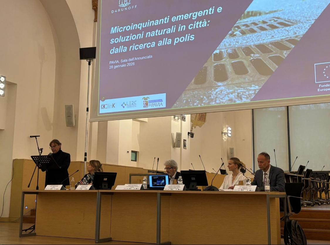 Cuore del convegno è stata la presentazione dei risultati del progetto D4Runoff, illustrato come caso studio sull’integrazione delle soluzioni basate sulla natura nella gestione del deflusso urbano, insieme al volume scientifico “Inquinanti Emergenti: Monitoraggio, Rischio e Rimozione”, pubblicato nel settembre 2025 dal Gruppo di Lavoro Microinquinanti Emergenti (GdL-MIE) di LE2C.